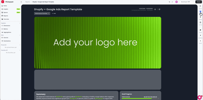 You don’t get a central brand kit upload or a one-click way to apply a consistent theme across reports, or even a straightforward way to add a client logo, which is weirdly hard to find for something so basic.